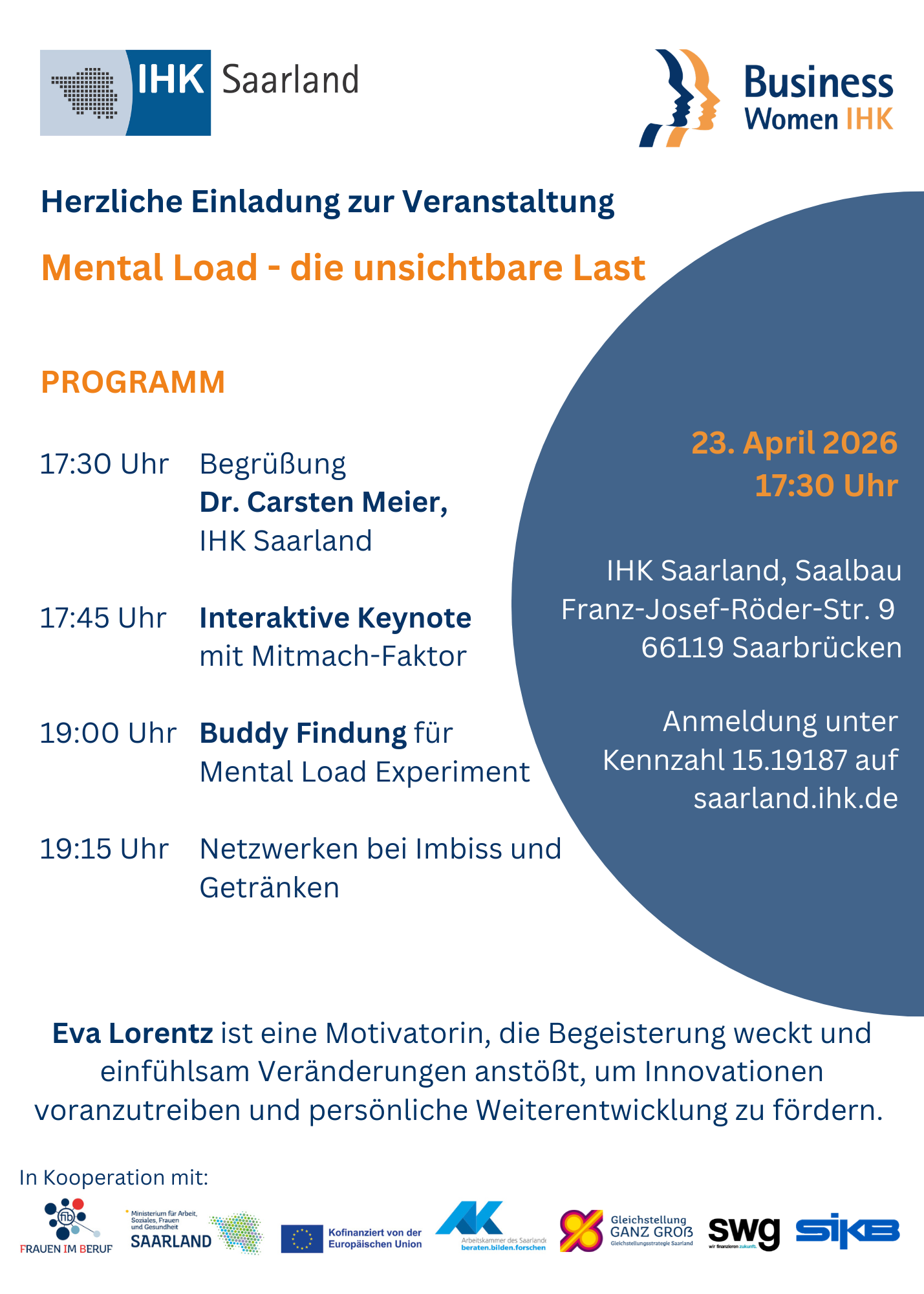 Eine Veranstaltung der IHK Saarland in Kooperation mit SWG, SIKB, Netzwerkstelle "Frauen im Beruf" im Rahmen der Gleichstellungsstrategie des Saarlandes.